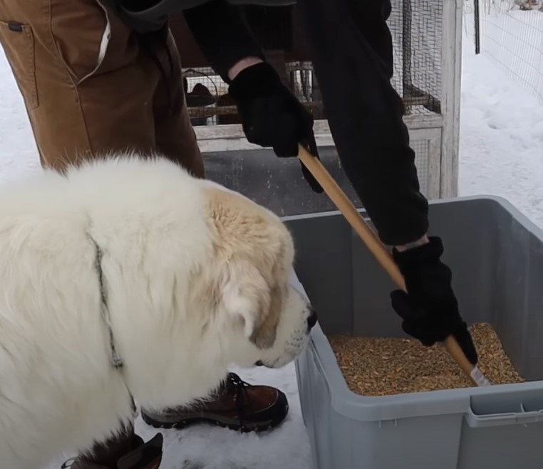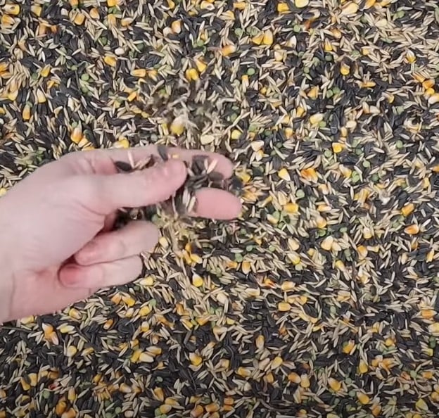 Since there are oats and corn in the tote, we’ll mix them until they are incorporated.